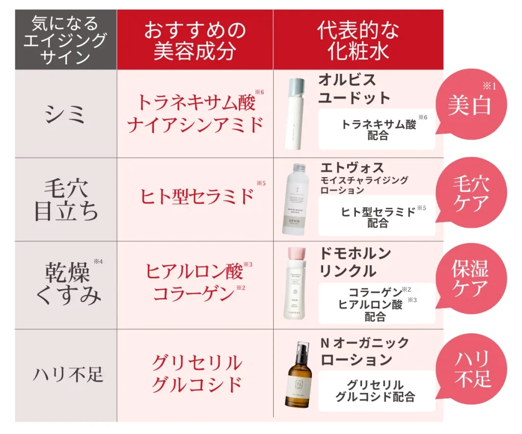 実は、化粧水に含まれる成分によって、効果への「得意」「不得意」があります。