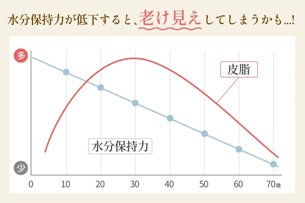 肌の水分量は30代をピークに減少し、60代では約3分の1ほどになってしまうんです…