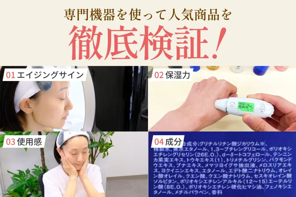 女性スタッフが専門機器を用いながら、エイジングサイン*1の変化/保湿力/使用感/成分など、使わないと分からない項目を超本音レビュー!