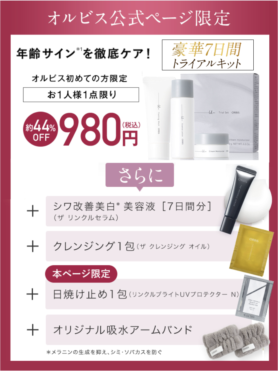 | お得なキャンペーン | 14日間分の7点お試しセット オルビス初回限定980円 | 7日分の4点お試しセット 価格980円 | 7日間分の7点お試しセット オルビス初回限定980円 |