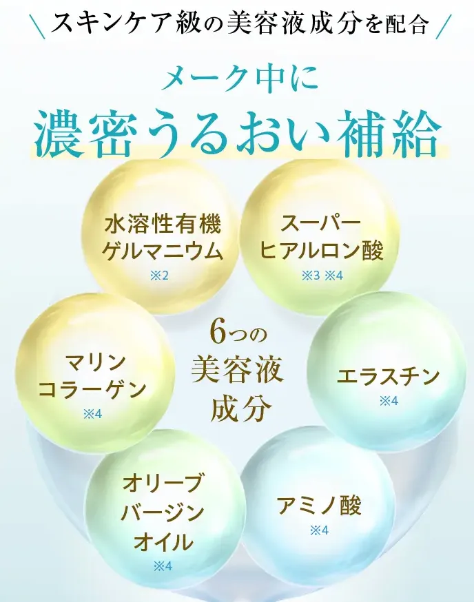 *2)メイクアップ効果による*3)保湿成分による*4)効能評価試験済み*5)すべての方に肌トラブルや皮膚刺激がおこらないということではありません。