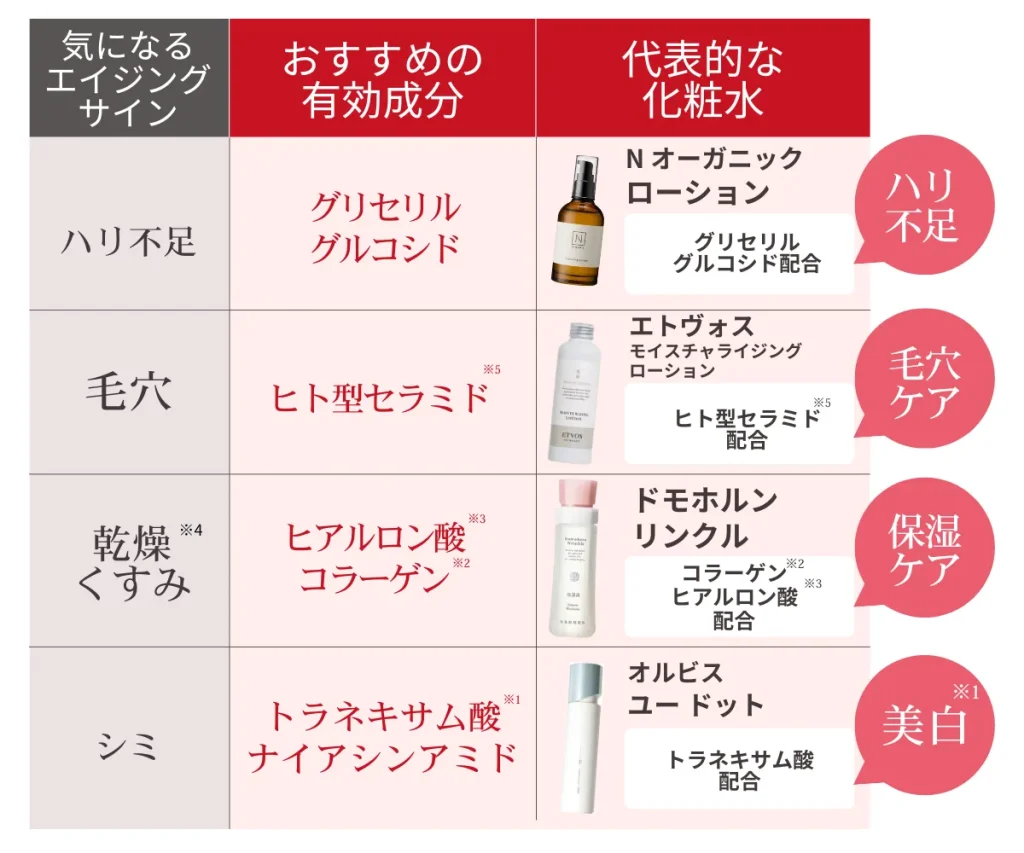 ただ、ドラッグストアで販売されている化粧水はエイジング成分が十分に入っていない商品もあるため、注意が必要です。