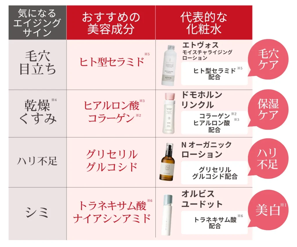 年齢に合った化粧水を選ぶ、悩み合った化粧水を選ぶ、正しいスキンケアを行う。