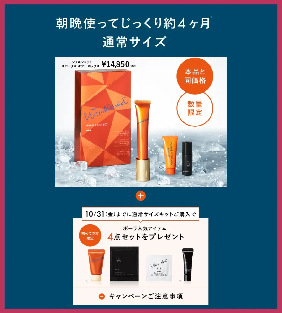 10/31までに購入すると初めての方限定で本品と同価格でポーラ人気アイテム4点セットがもらえるキャンペーンを実施中!
