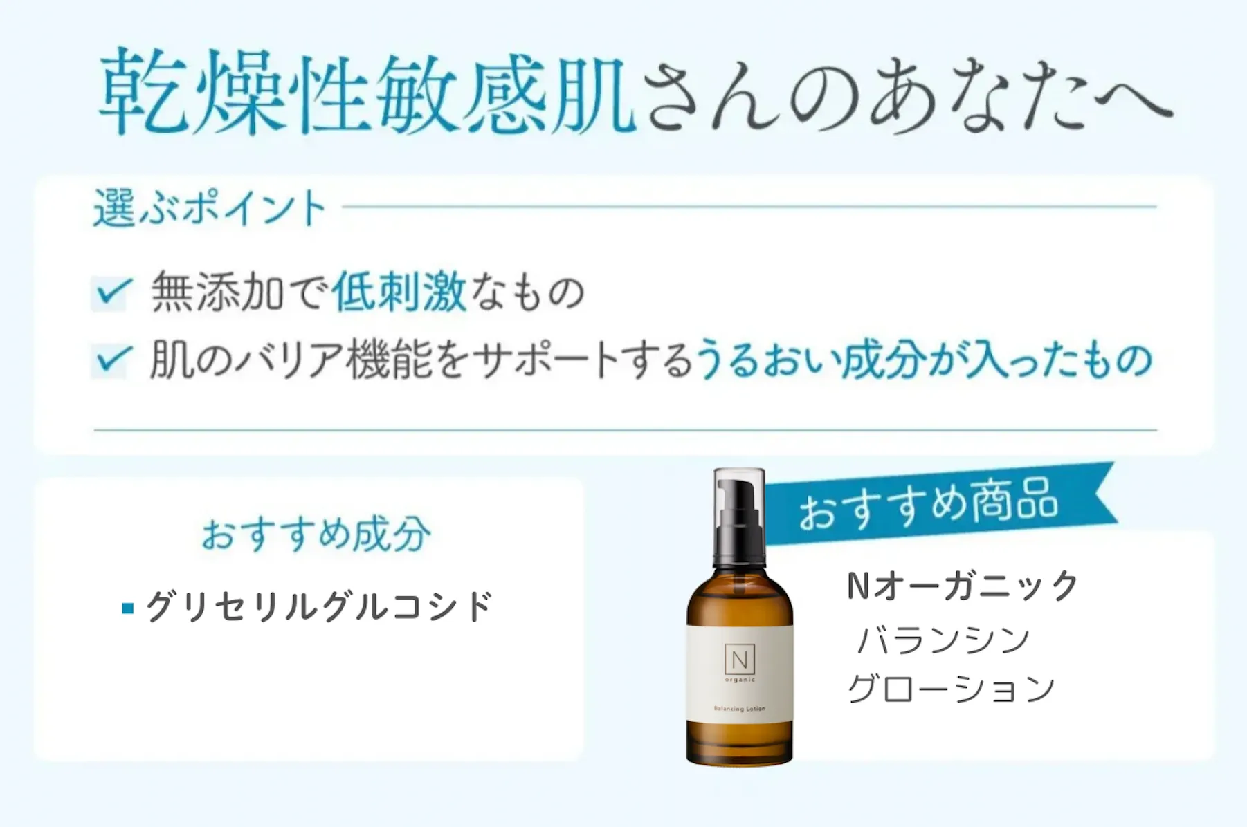 具体的な商品で言うと、今回のBEST4でも紹介する「Nオーガニック ローション」はグリセリルグルコシドが十分に含まれているため心からオススメします!