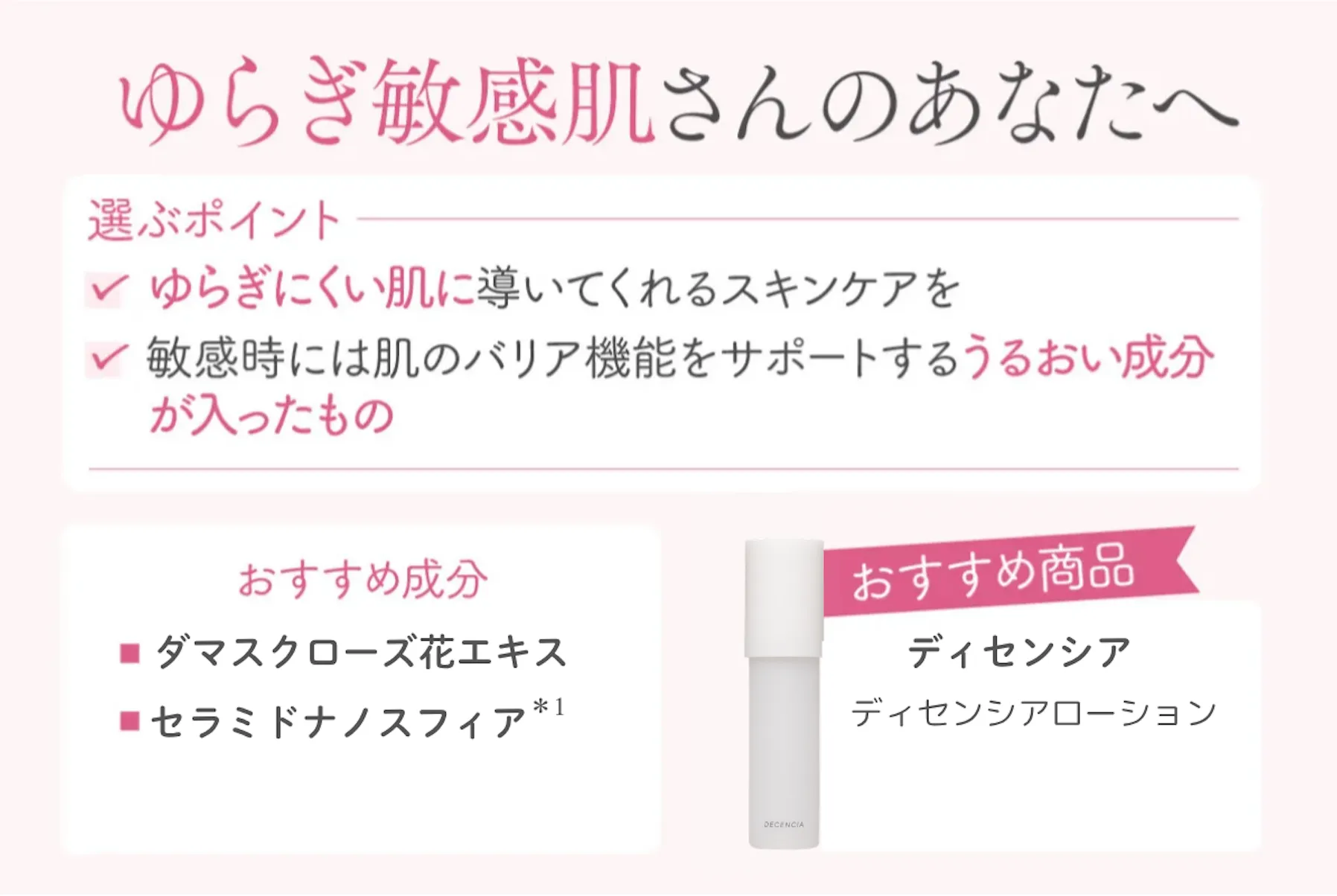 継続して使うことで肌体力をサポートして、ゆらぎにくい肌に導いてくれるスキンケアを選ぶことが大切です。敏感時にはやはり保湿が必須で、「ダマスクローズ花エキス」や「セラミドナノスフィア*6」の成分を含む「ディセンシアローション」などの化粧水をおすすめします!
