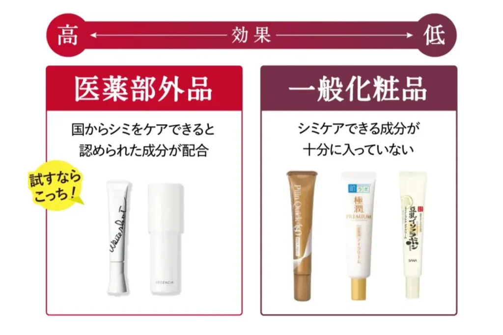 ドラッグストアなどで売られている一般化粧品はシミをケアできないので、シミ予防*ができる「医薬部外品」を選びましょう!