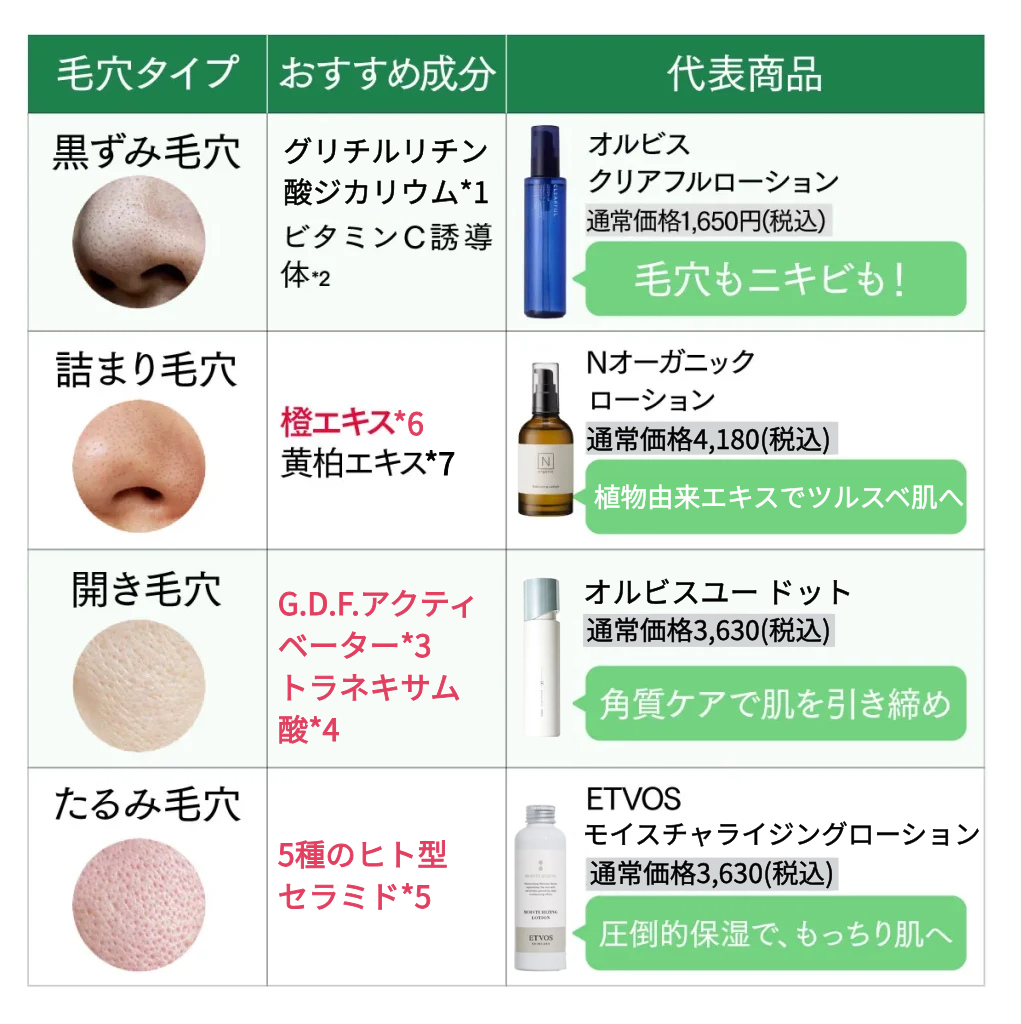 さらに、毛穴タイプごとに使うべき成分とおすすめの化粧水を下図にまとめてみました!
