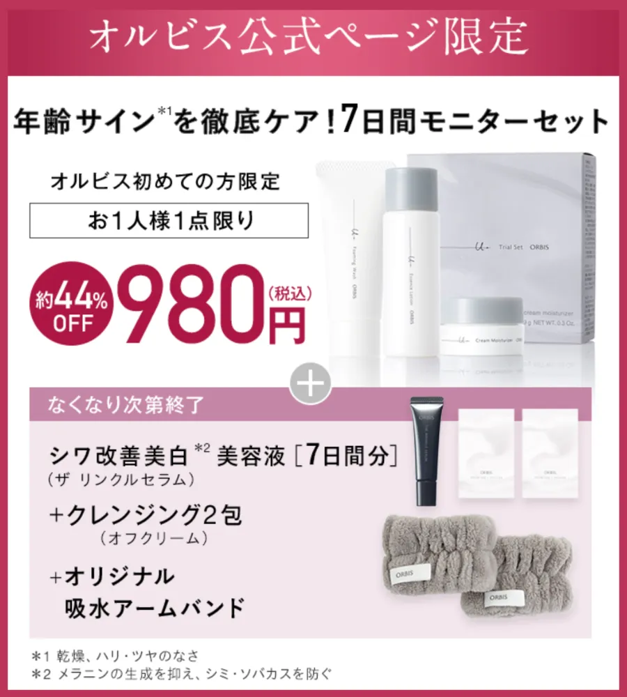 これらすべてがセットになったオルビス初回限定7日間お試しセットを、数量限定で約44%OFFの980円(税込)でご用意していますよ。