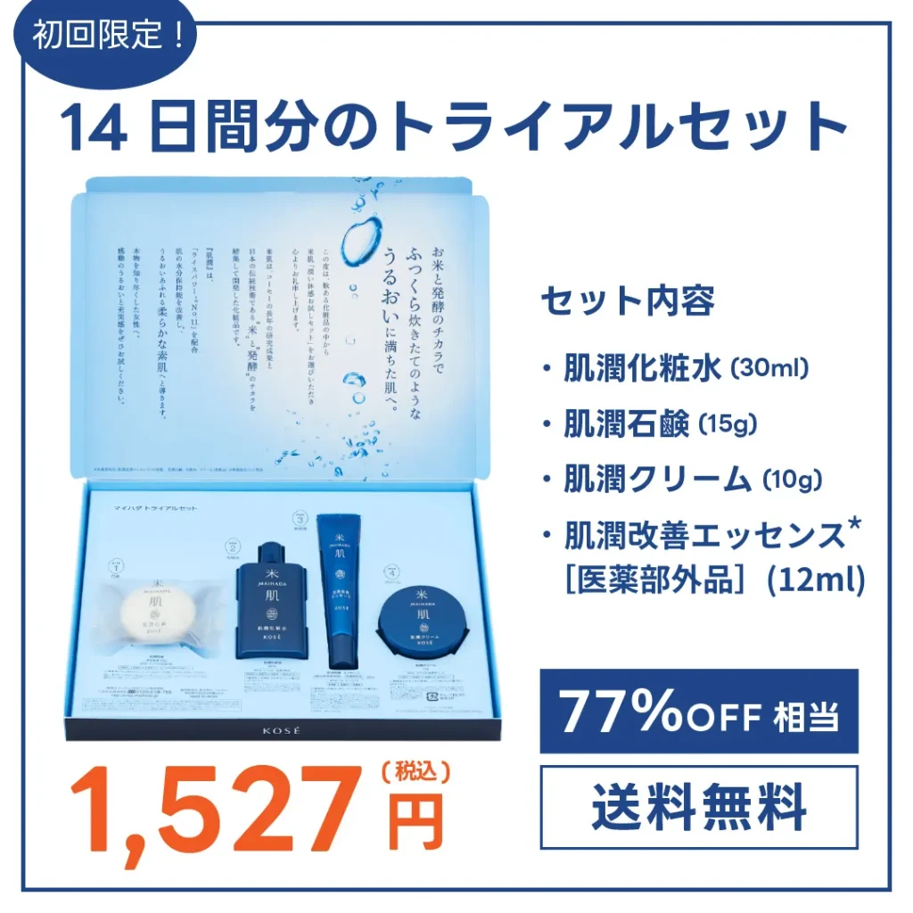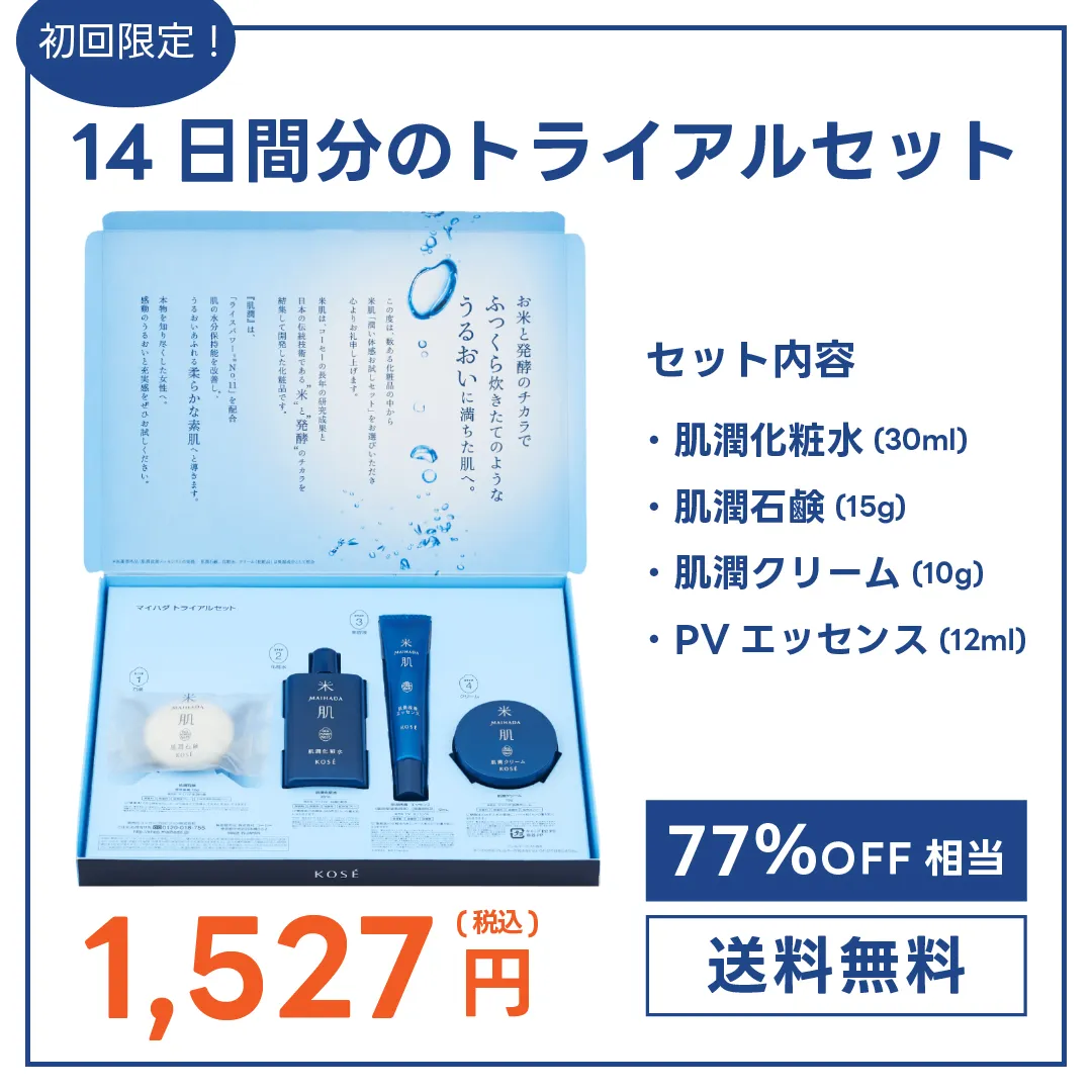しかし、初めての方限定で14日間分のトライアルセット「潤い体感セット」が、定価約77%OFF相当の1,527円(税込)で試せるんです!