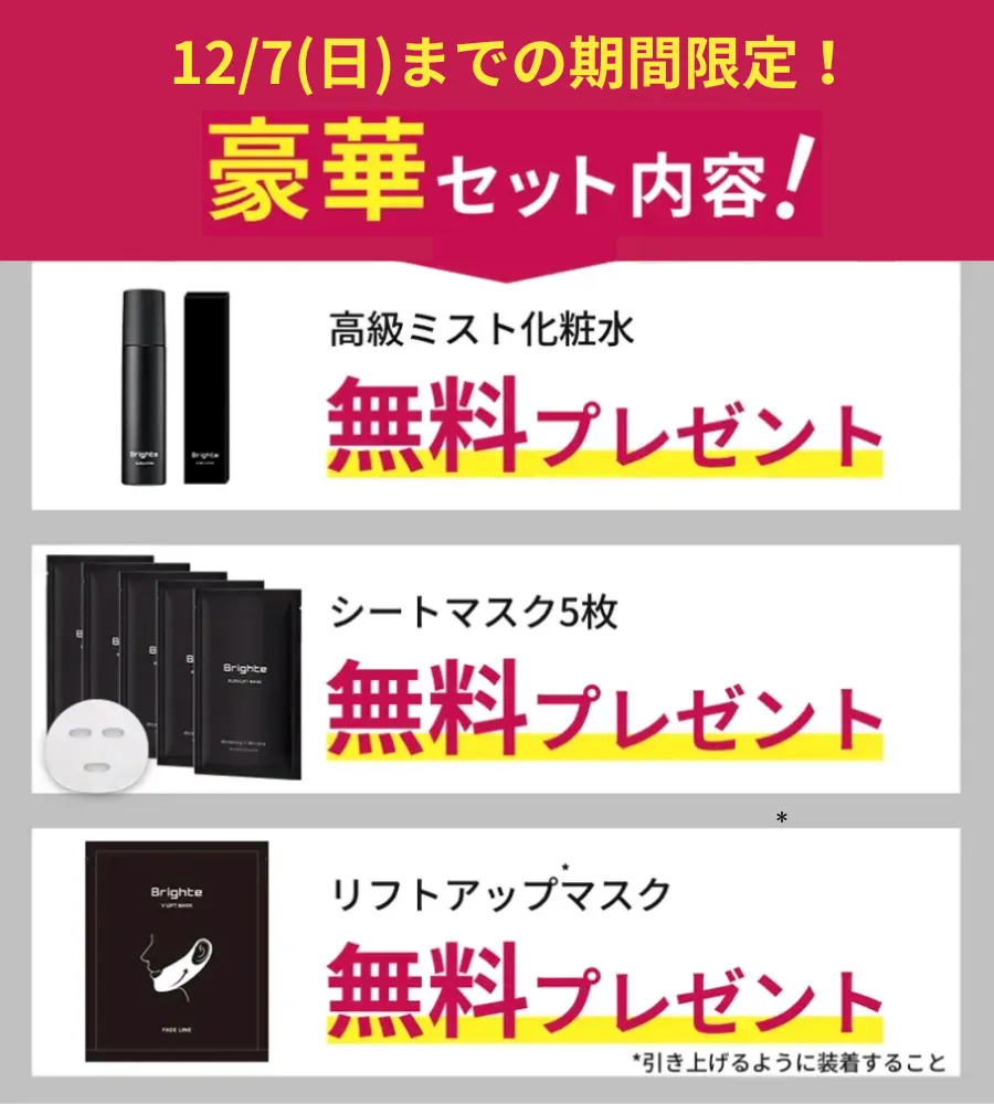 さらに、期間限定12/7(日)までに購入すれば、高級ミスト化粧水、シートマスク1箱、リフトアップマスクを無料プレゼント!*