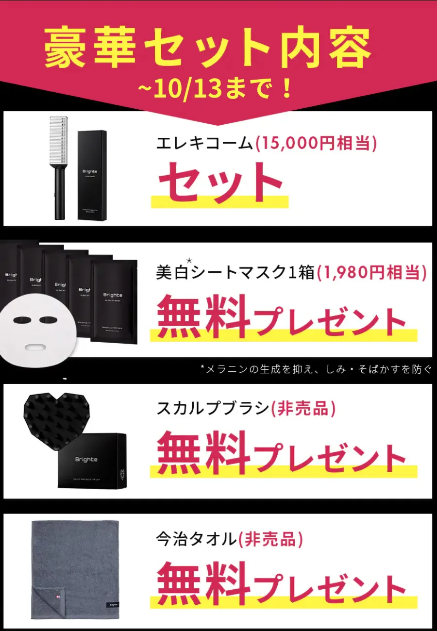 さらに、期間限定10/13日(月)までに購入すれば、美白シートマスク1箱、非売品のスカルプブラシ、非売品の今治タオルの豪華3点セットをプレゼント!*