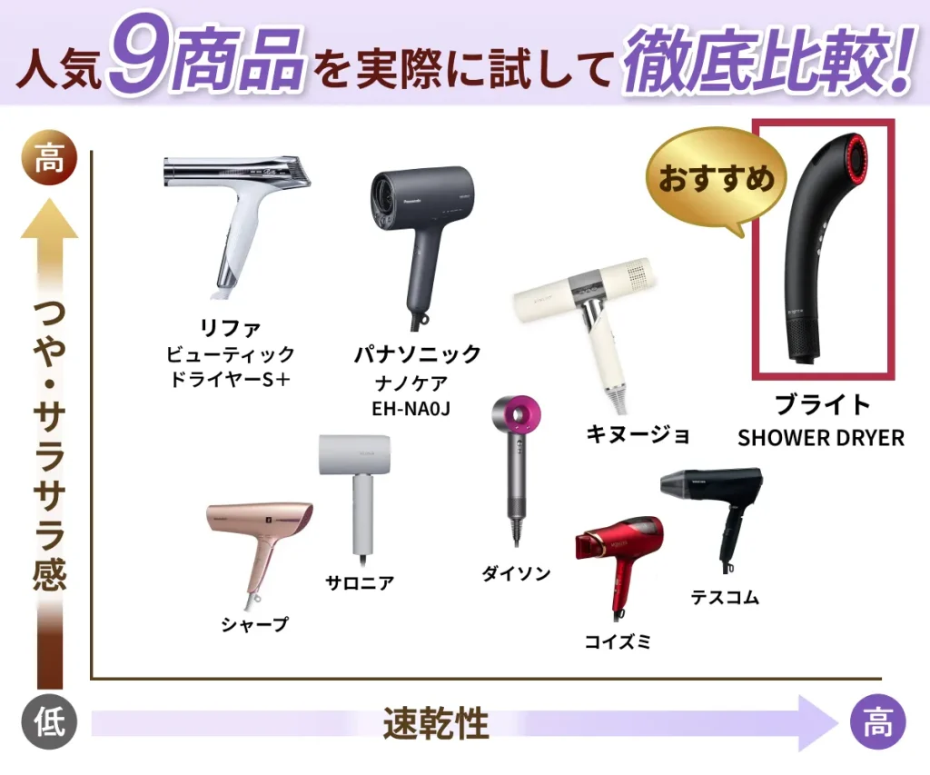 | 商品名 | ![]() Brighte(ブライト) シャワードライヤー | ![]() キヌージョ ヘアードライヤー | ![]() パナソニック ナノケア EH-NA0J |