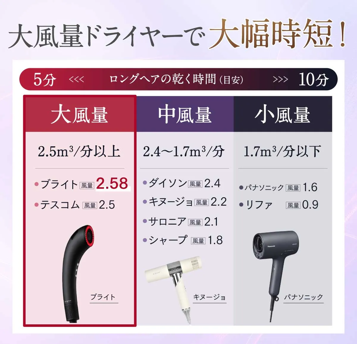 | 速乾性 | 大風量でパッと乾く! 2.58m3/分*1 | ◎ 中風量 2.2m3/分 | ◯ 小風量 1.6m3/分*2 |