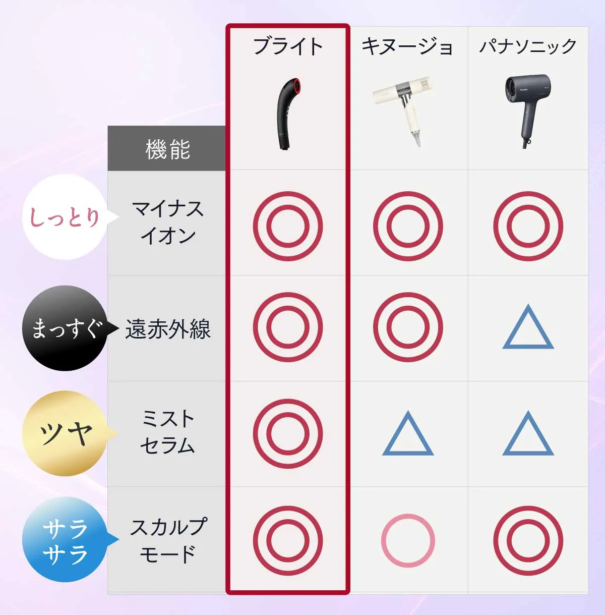 | 潤い・ツヤ | ミストセラム噴射 髪の水分量が200%*5UP! | ◯ マイナスイオン噴射 | ◎ 高浸透ナノイー噴射 |