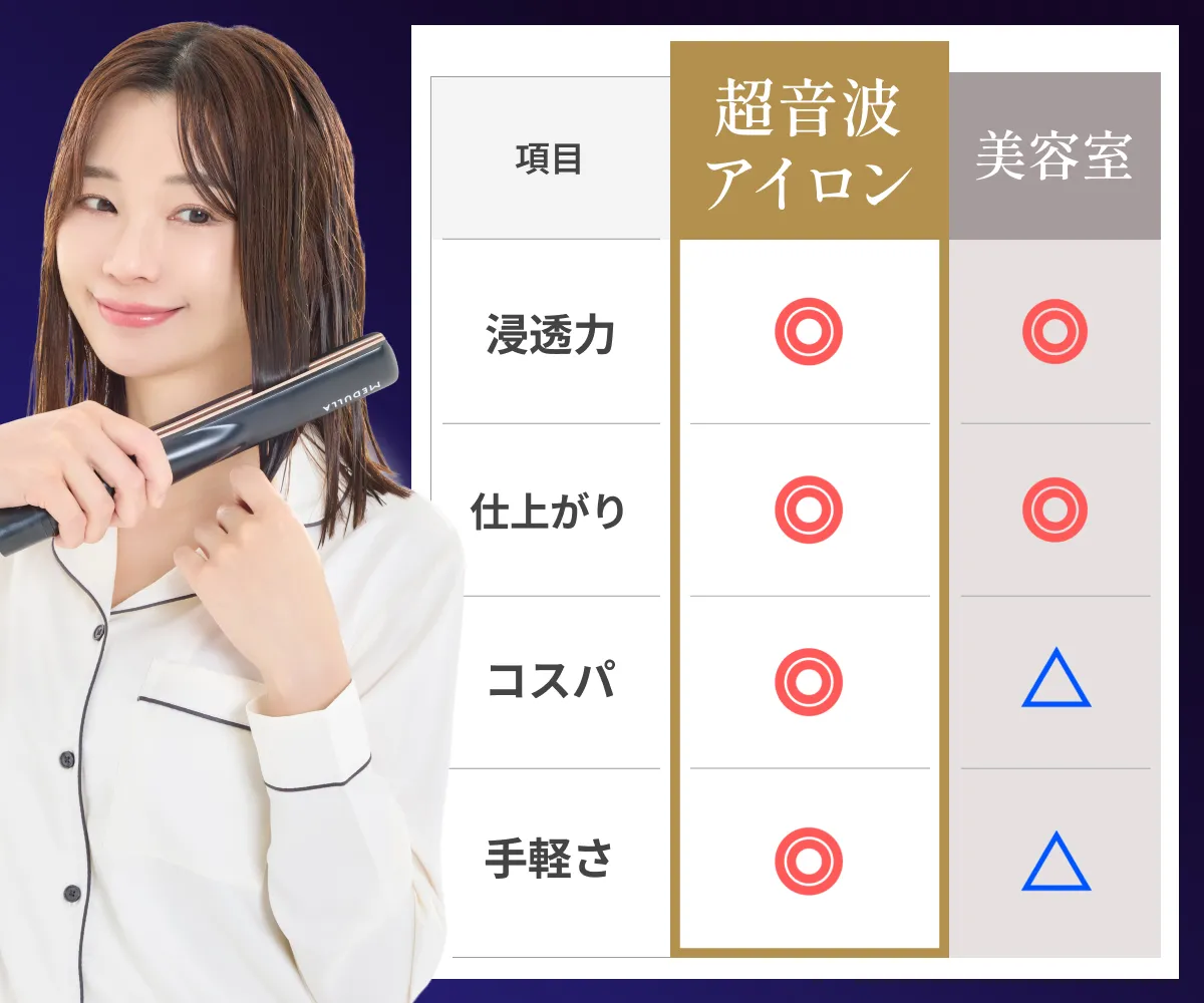 超音波アイロンは、超音波の力でトリートメントを浸透させて、パサつきやうねりを解消!