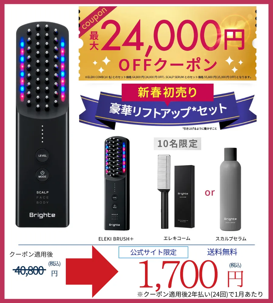なんと、下記のボタン経由なら、エレキブラシ+と、スカルプセラムかエレキコームが入った豪華なセットが最大24,000円引きになるクーポンが使えちゃいます!