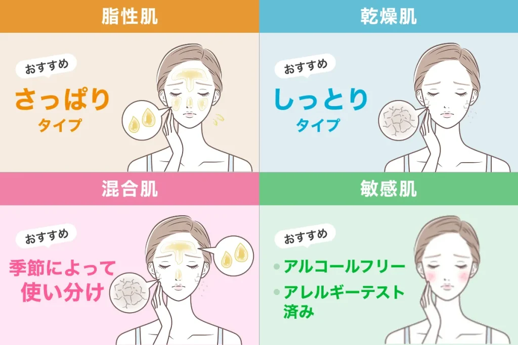 | 敏感肌 | アレルギーテスト済み※4 日本人の肌向けの処方 アルコールフリー | ◎ アレルギーテスト済み | ◯ アレルギーテスト済み |